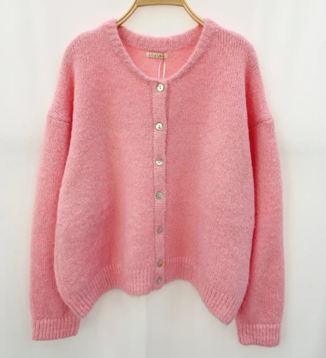 Gebreid vestje reversible met knoopje in roze taupe en groen