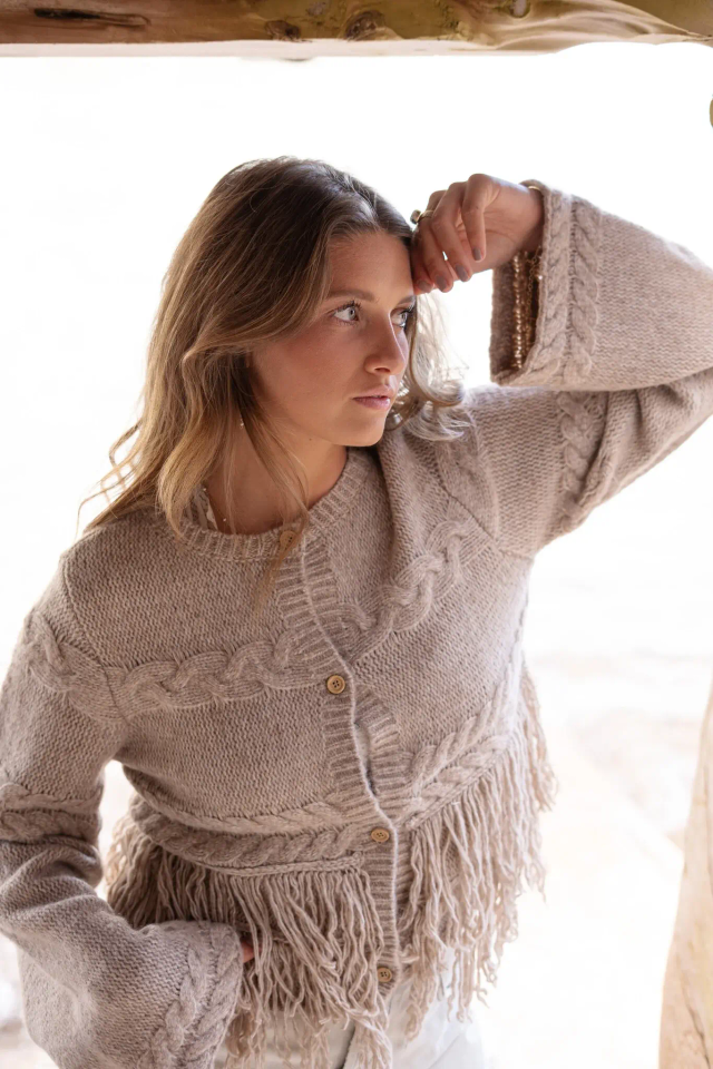 Ontdek de Fringe Jacket Daira Beige, een fijn gebreid vestje met speelse franjes dat elke outfit een